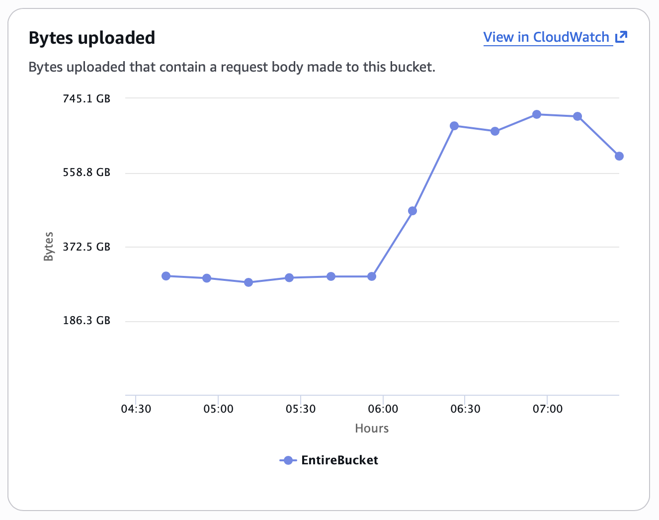 CloudWatch’s BytesUploaded metric was more useful, but its presentation is confusing. Given the graph below, what is the upload rate? I initially read this as 300GB per hour on that flat part of the graph, since the axis is Bytes vs Hours, but that isn’t how it works.